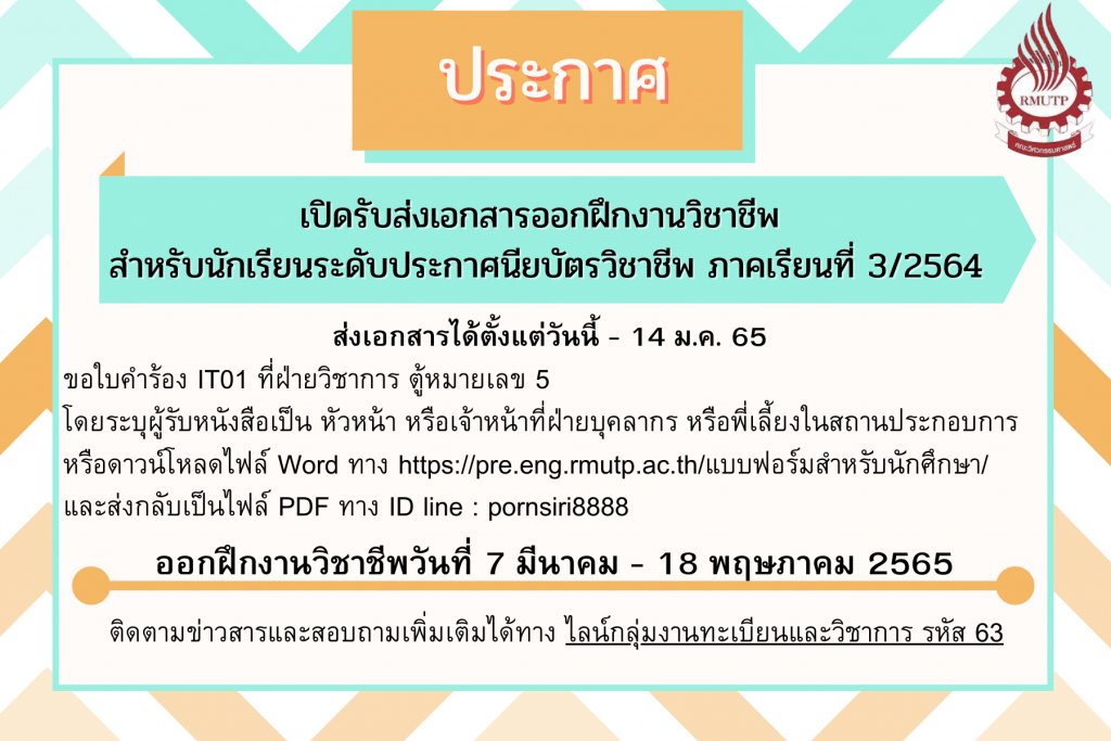 ประกาศ เปิดรับส่งเอกสารออกฝึกงานวิชาชีพ ระดับ ปวช. ภาคการศึกษา 3/2564