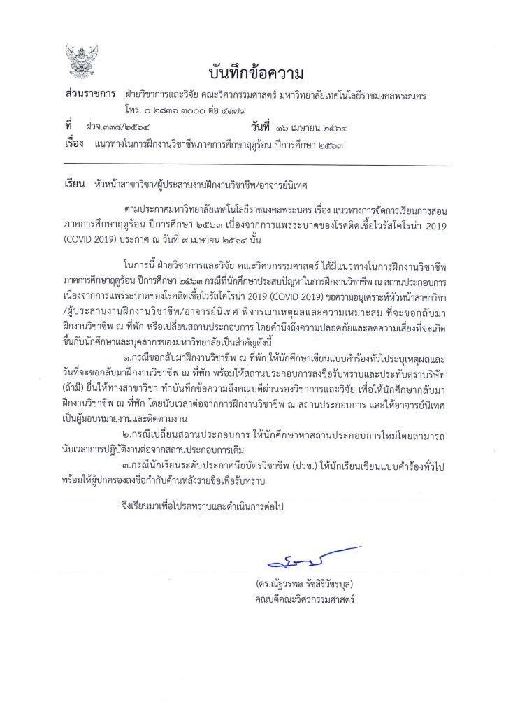 ตามประกาศ ณ วันที่ 9 เมษายน 2564 มหาวิทยาลัยเทคโนโลยีราชมงคลพระนคร เรื่อง แนวทางในการจัดการเรียนการสอนภาคการศึกษาฤดูร้อน ปีการศึกษา 2563 เนื่องจากการแพร่ระบาดของโรคติดเชื้อไวรัสโคโรน่า 2019 (COVID-2019)
