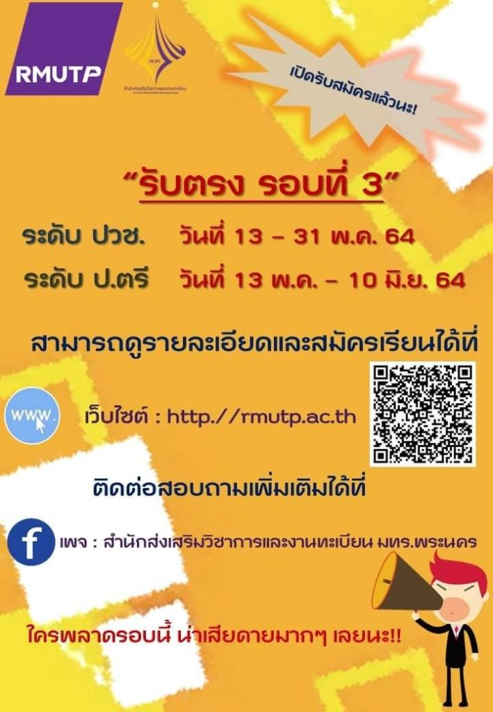 การรับสมัคร ทางเว็ปไซต์ที่ www.rmutp.ac.th หรือ http://reg.rmutp.ac.th/registrar/apphome.asp เปิดรับสมัครแล้วรับตรง รอบ 2 ตั้งแต่วันนี้จนถึง 15 เมษายน 2564 โดยผู้สมัคร **ใช้วุฒิม.3** ในการสมัครเท่านั้น ติดต่อรายละเอียดเพิ่มเติมได้ 02-836-3000 ต่อ 4118 4112