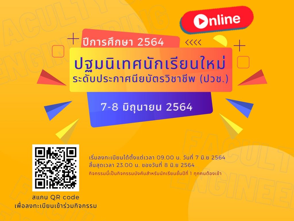 เชิญนักเรียนใหม่ระดับประกาศนียบัตรวิชาชีพ (ปวช.) ปีการศึกษา 2564 เข้าร่วม โครงการปฐมนิเทศนักเรียนใหม่ ประจำปีการศึกษา 2564 (รูปแบบออนไลน์) ระหว่างวันที่ 7-8 มิถุนายน 2564