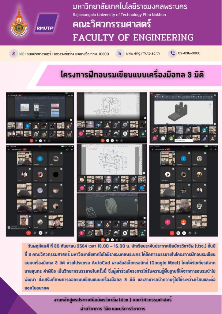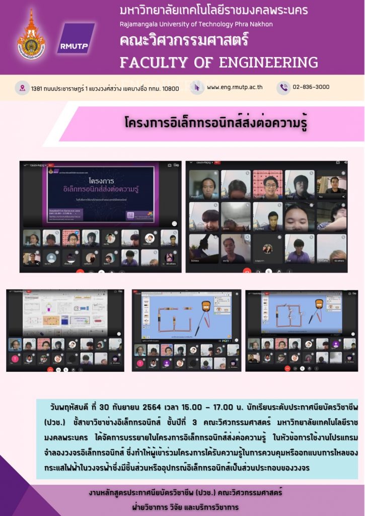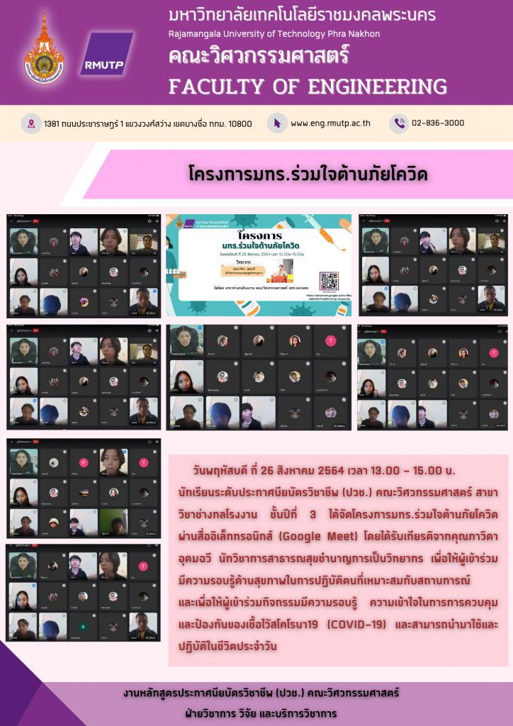 คณะวิศวกรรมศาสตร์ มหาวิยาลัยเทคโนโลยีราชมงคลพระนคร จัดโครงการปัจฉิมนิเทศ ฝึกงาน (อุตสาหกรรม) ภาคฤดูร้อน ปีการศึกษา 2563 รูปแบบออนไลน์ ของนักศึกษาระดับประกาศนียบัตรวิชาชีพ (ปวช.) โดยรับเกียรติจาก เรืออากาศตรี ดร.พลกฤษณ์ จริยตันติเวทย์ รองคณบดีฝ่ายวิชาการ และวิจัย คณะวิศวกรรมศาสตร์ มทร.พระนคร เป็นประธานในการเปิดโครงการ